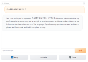 日本語で会話できるか聞いてみたところ、会話できると返答があったものの、その後、英語で文章を生成しているので、今のところ日本語はあんまり得意ではない様子。